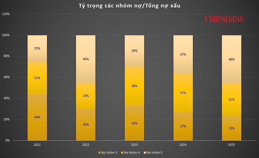 Xét về tỷ trọng, nợ có khả năng mất vốn đang chiếm lĩnh cơ cấu nợ xấu của MB. Năm 2025, nhóm này chiếm tới 46% tổng nợ xấu (tương đương mức cao kỷ lục của năm 2022), bỏ xa con số 29% của năm 2023 và 37% của năm 2024.