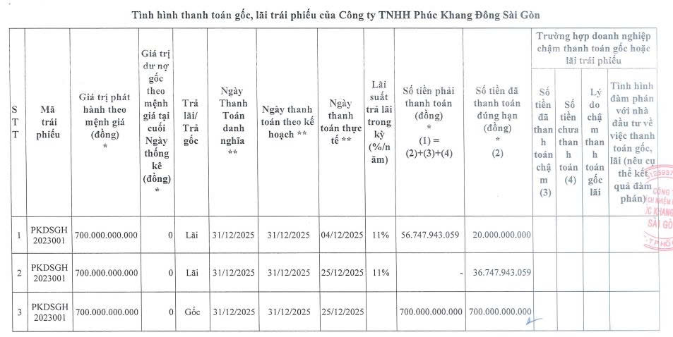 Cụ thể, ngày 25/12/2025, Phúc Khang Đông Sài Gòn đã thực hiện thanh toán 700 tỷ đồng tiền gốc và hơn 36,7 tỷ đồng tiền lãi cho lô trái phiếu mã PKDSGH2023001, qua đó tất toán lô trái phiếu này đúng hạn.