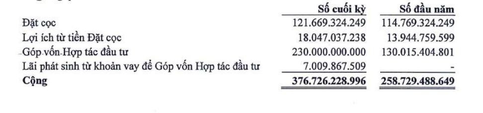 Chi tiết các khoản đặt cọc, lợi ích từ đặt cọc, góp vốn và lãi phải thu liên quan đến khoản vay ngân hàng để góp vốn như sau:
